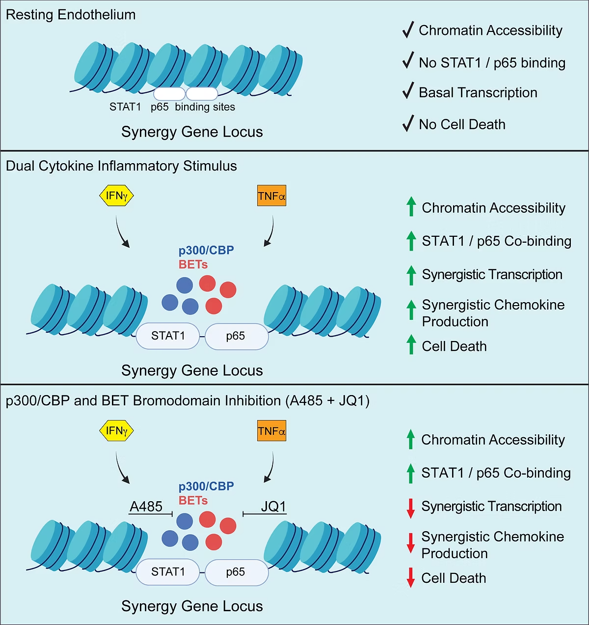 To discover coactivator dependencies, we conducted a targeted chemogenomic screen of transcriptional inhibitors followed by modelling of inhibitor dose-response curves. These results identified high efficacy of either p300/CBP or BET bromodomain inhibitors to disrupt induction of synergy genes. Combination p300/CBP and BET bromodomain inhibition at subIC50 concentrations synergistically abrogated IFN/TNF-induced chemokine gene and protein levels.