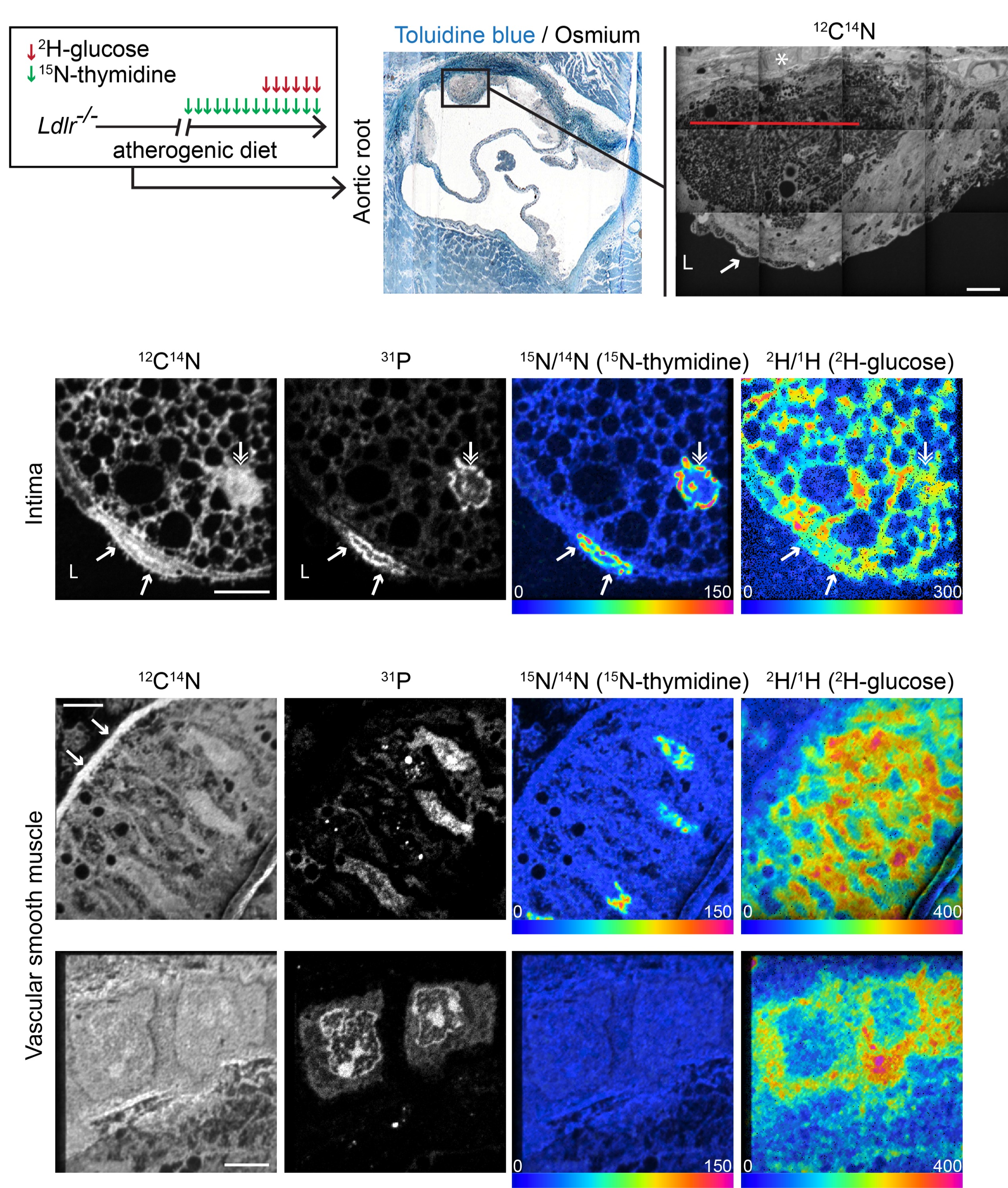 We used Multi-isotope Imaging Mass spectrometry (MIMS), a quantitative imaging platform, to measure coincident cell division and glucose utilization at suborganelle resolution in atherosclerotic plaques. In established plaques, 65% of intimal foam cells but only 4% of medial VSMCs were labeled with 15N-thymidine after 1 week of isotope treatment. Dividing cells demonstrated heightened glucose labeling. MIMS detected 2H-glucose label in multiple subcellular compartments within foam cells including lipid droplets, the cytosol and chromatin. Unexpectedly, we identified an intensely focal region of 2H-label in VSMCs underlying plaques. This signal diminished in regions of aorta without atherosclerosis. In advanced plaques, 15N-thymidine and 2H-glucose labeling in foam cells and VSMCs significantly decreased.