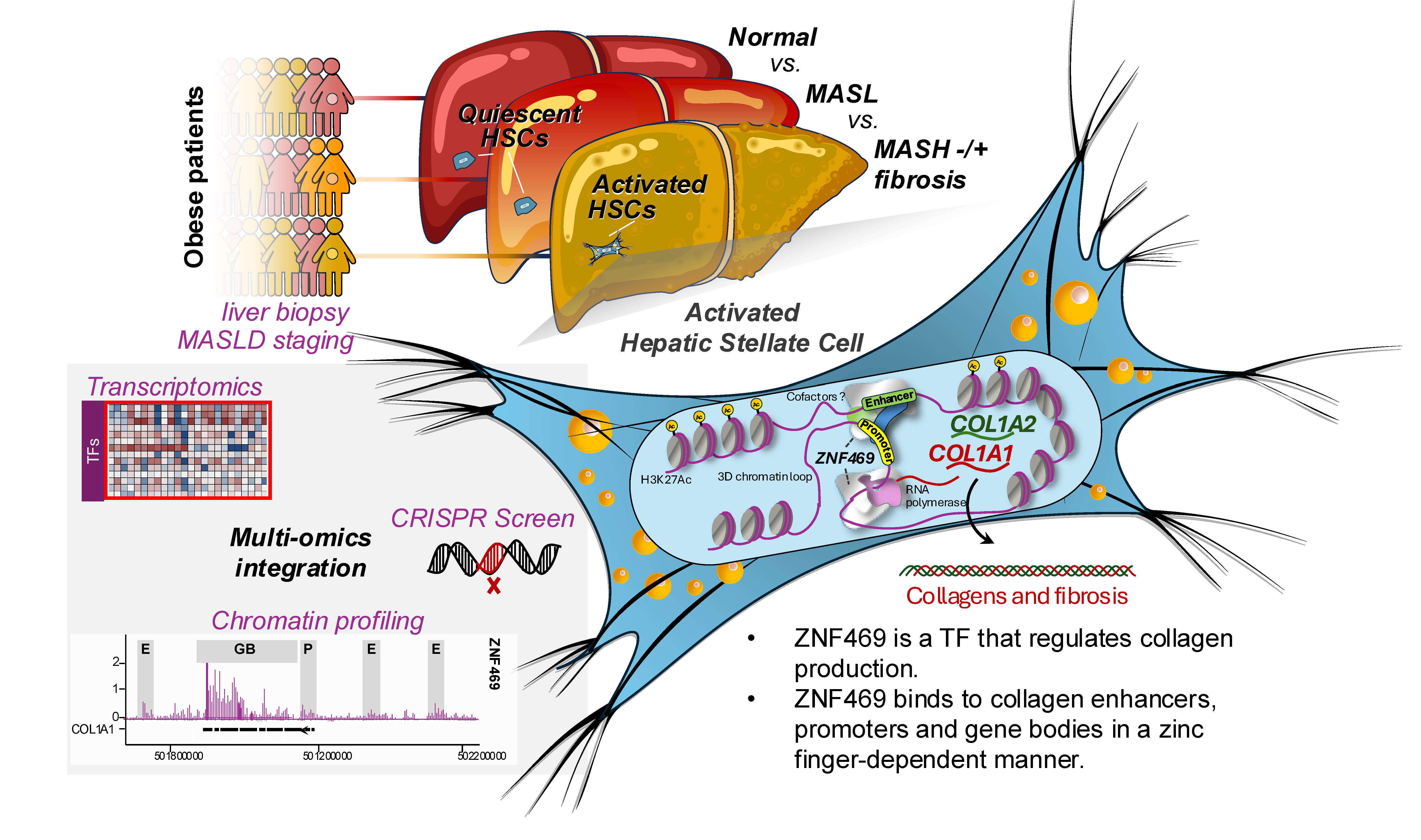 By integrating multiomic large-scale profiling of human biopsies with extensive experimental validation, we demonstrate that ZNF469 is a transcriptional regulator of collagen in HSCs. Overall, these data nominate ZNF469 as a previously unrecognized determinant of MASLD-associated liver fibrosis.